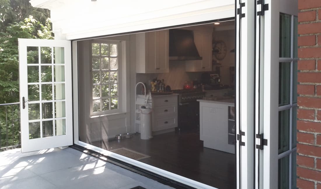 The frame colors are matched to your existing doors, and housings are placed where they blend with the trim. When you retract the screen, the cassette sits neatly to the side, keeping your glass doors clear while still being ready when you want airflow.
